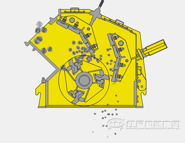 工作時,轉子由電動機經三角皮帶傳動作固定方向旋轉,在其機體上面懸掛著一組反擊板,活性石灰由裝料口,經進料導板落入轉子上,被固定在轉子上的板錘打擊到反擊板上,再從反擊板上落下與轉子連續打上去的活性石灰塊互相沖擊,因此活性石灰塊在反擊板、轉子、導板、鏈幕之間所形成的破碎腔內,周而復始的反復運動,而產生強烈的沖擊現象,活性石灰塊沿其自然裂縫或凹陷破碎,從排料口排出。